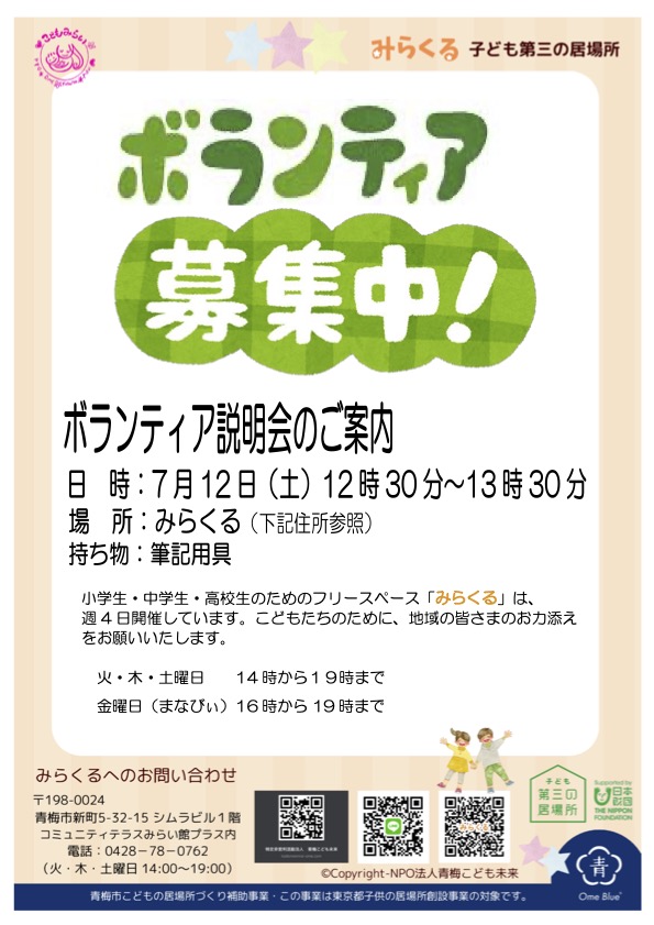 子ども第三の居場所みらくる ボランティア説明会のお知らせ 投稿日: 2025/07/02投稿日 2025/07/02 居心地の良い館内で、子どもたちとの時間を過ごしてみませんか? 毎週火曜日・木曜日・金曜日・土曜日にコミュニティテラスみらい館プラスで開催している「子ども第三の居場所みらくる」のボランティア活動の内容説明会を開催いたします。 子どもたちの健やかな成長のために地域の皆さまの応援をお待ちしております! 参加費:無料 対象:19歳以上 定員:15名程度(予約不要)