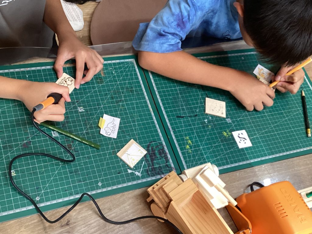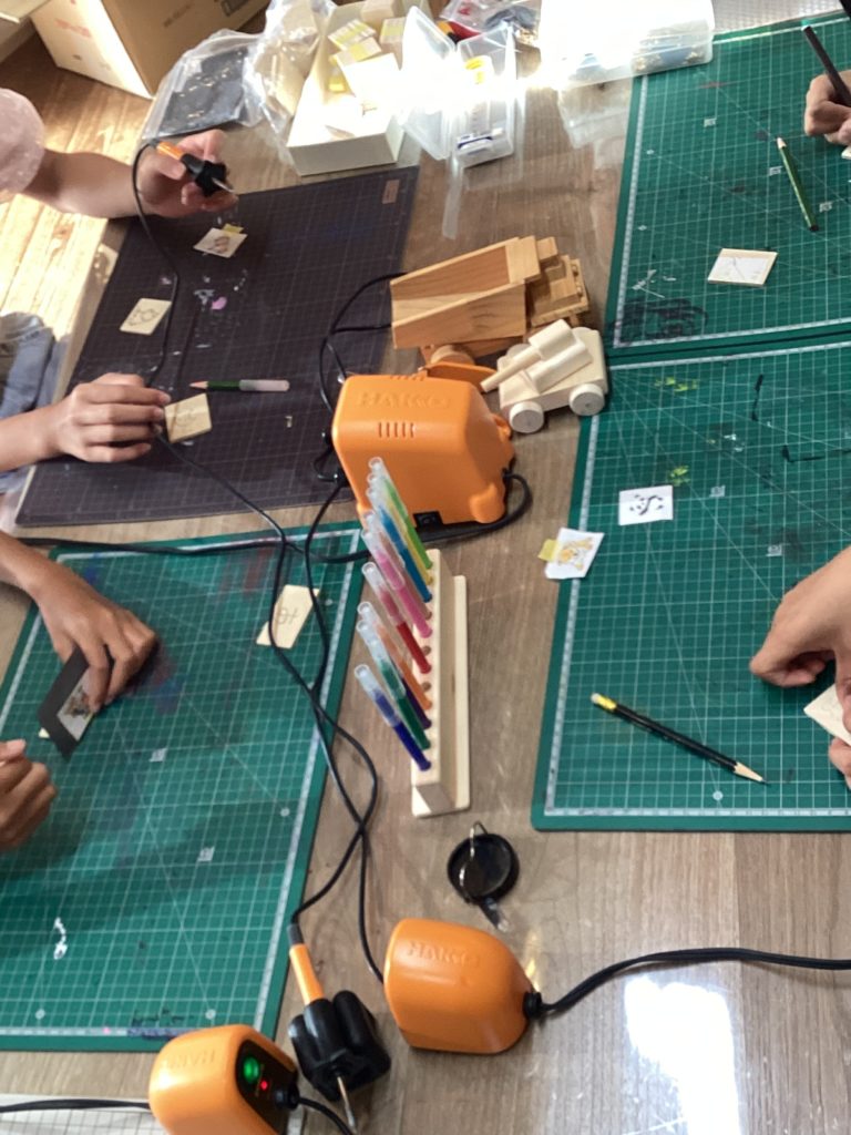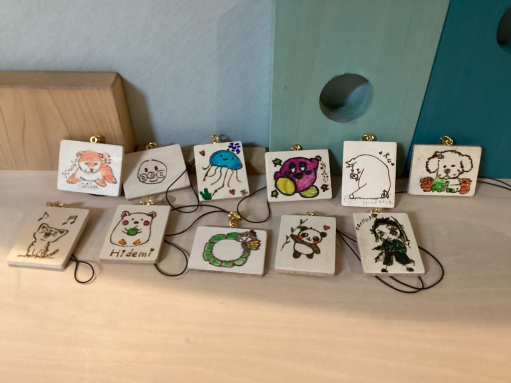 最初に木の話しを聞いて色々な木にも触れることができました。そして待ちに待ったバーニングペンを使ってのストラップ作り!それぞれ個性豊かな作品ができました。子どもたちも楽しかったようで、「次はいつ❔」と帰って行く子どもさんもいました。