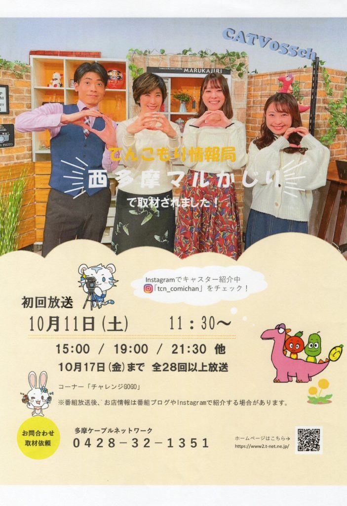 TCN「西多摩マルかじり」取材受けました! 投稿日: 2025/10/11投稿日 2025/10/11 10月11日(土) ~ 18日(土) 11:30~ /15:00 ~ /19:00~ /21:30他 TCNにて放送されます。 みらくるってこんなとこ~の一場面が見て頂けるかもです!