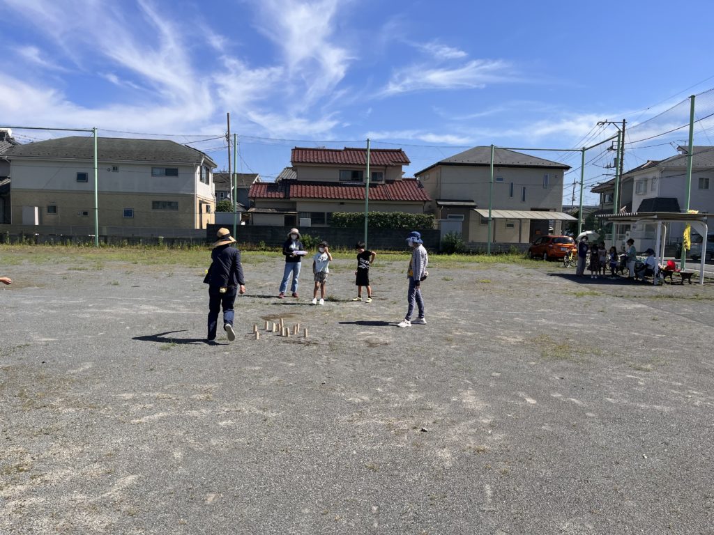 大人も子どもも モルック、大縄跳び、シャボン玉で大いに体を動かしました。まだまだ暑い日でしたが、ポカリスエットや凍ったゼリーでクールダウンしながらも大歓声で遊びました。