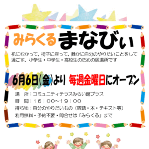 机に向かって、椅子に座って、静かに自分のやりたいことをして過ごす 小学生・中学生・高校生のための居場所です。 16:00~19:00 毎週金曜日 持ち物:宿題・本・ドリル・テキスト等 詳細はみらくるにお問い合わせください […]
