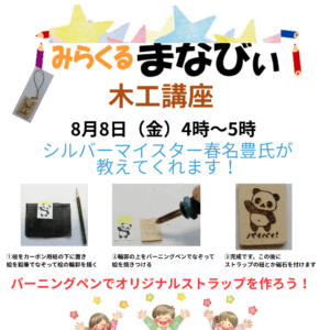 8月8日(金)4時~5時まで 参加自由 無料! 木工シルバーマイスターの春名豊氏が講師で木工講座を開催します。自分だけのオリジナルのストラップを作りましょう!マグネットにもなりますよ(^^♪ 参加は自由です。4時から […]