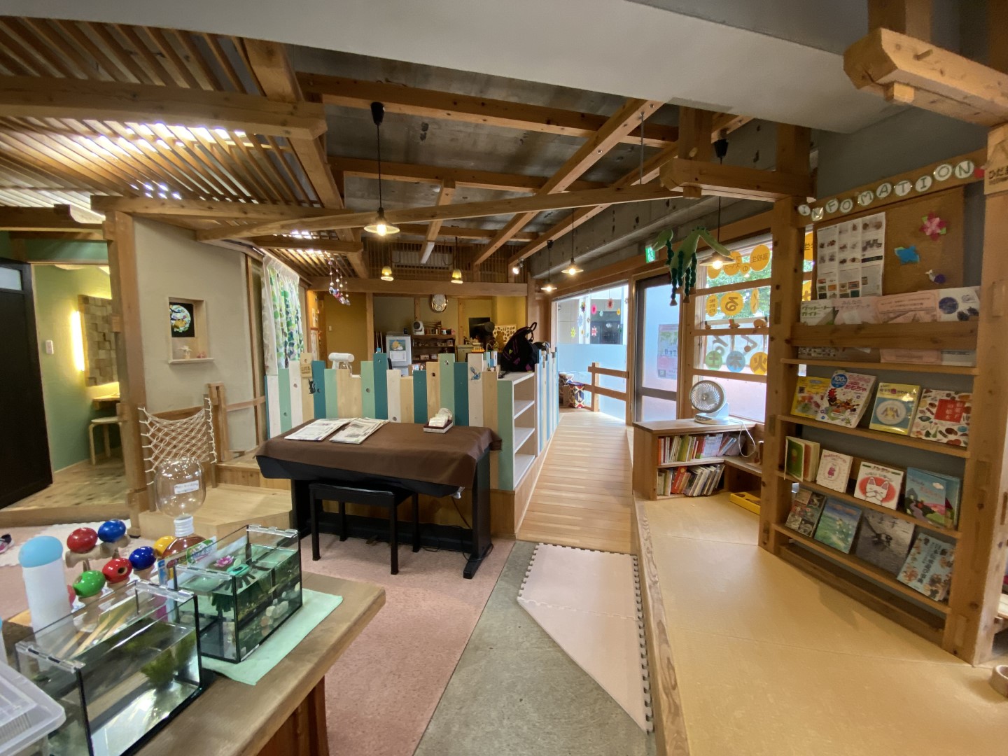 無垢材をふんだんに使用した館内。のびのびできる木立スペースと、おしゃれにライティングされた木かげスペース。畳みの可愛らしい小上がりスペース・ひだまりは子どもに大人気。