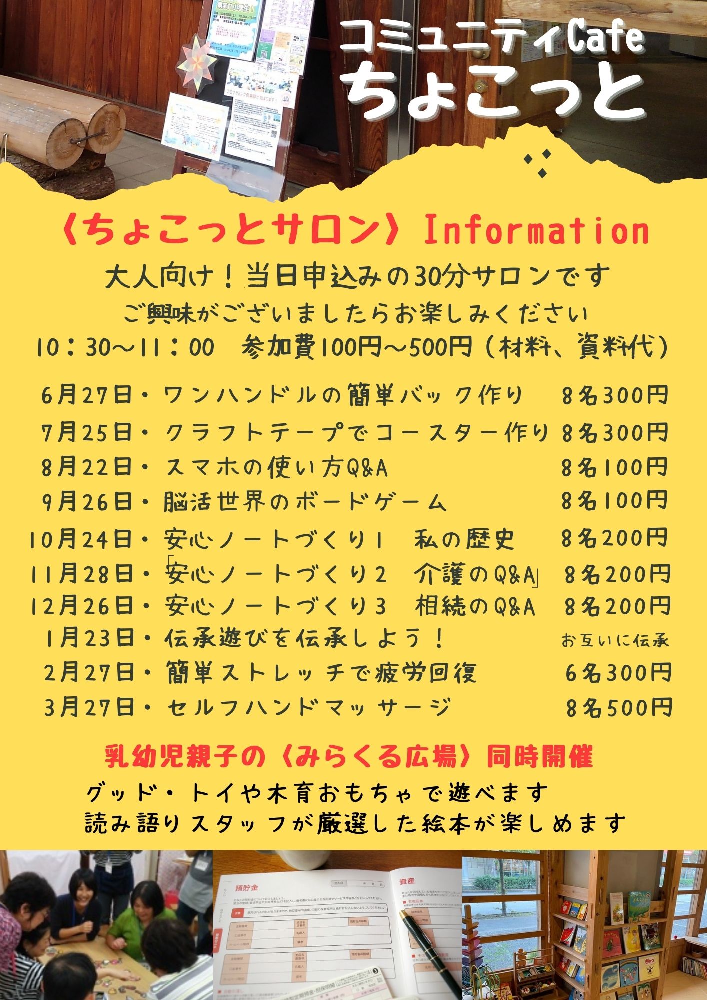 10:30~11:00 参加費100円~500円(材料、資料代)で開催します。