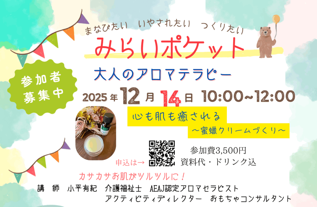 心も肌も癒されるアロマテラピー 今回は、お肌の潤いに欠かせない蜜蝋クリーム作りです。 リラックス効果、自律神経の調整、睡眠の質の向上、ストレスの緩和、集中力向上など,心身両面に働きかける効果が期待されます。香りをかぐこと […]