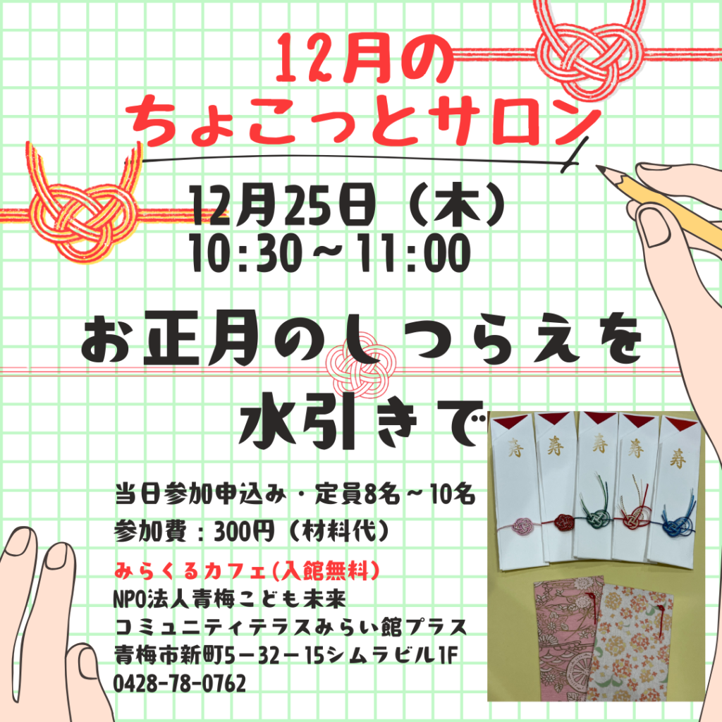 お正月のしつらえを水引きで 12月は大人気のクラフトです。 今回はお正月の手仕事。 水引が素敵な箸袋を作ります。 お正月が待ち遠しくなりますね。 ぜひご参加ください。 12月25日(木) 10:30-11:00 コミュニ […]