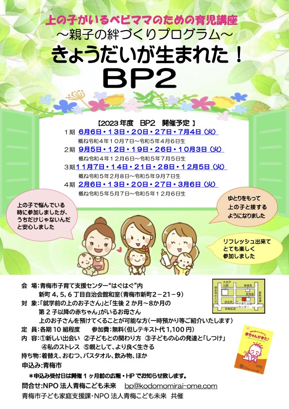 9月より第2期がはじまります。 「親子の絆づくりプログラム”きょうだいが生まれた!” (BP2プログラム)」は、2人目以上の赤ちゃんを育てている母親と赤ちゃんが一緒に参加するプログラムです。 今年 […]