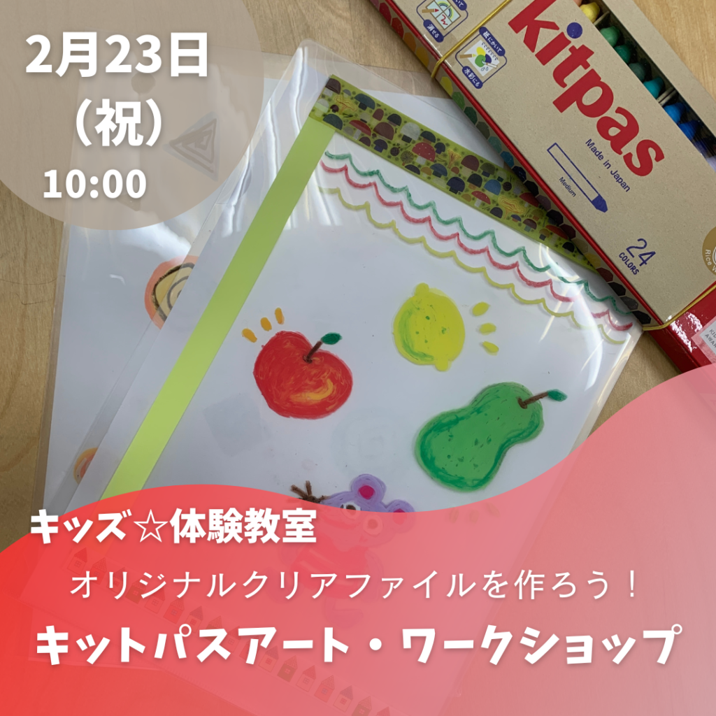 キットパスアート・ワークショップ ~オリジナルクリアファイルを作ろう~ 小学生対象のキッズ体験講座です。 自然に優しい画材キットパスを使って、自分だけのクリアファイルを作成します。 2月23日(祝) 10:00-11:3 […]