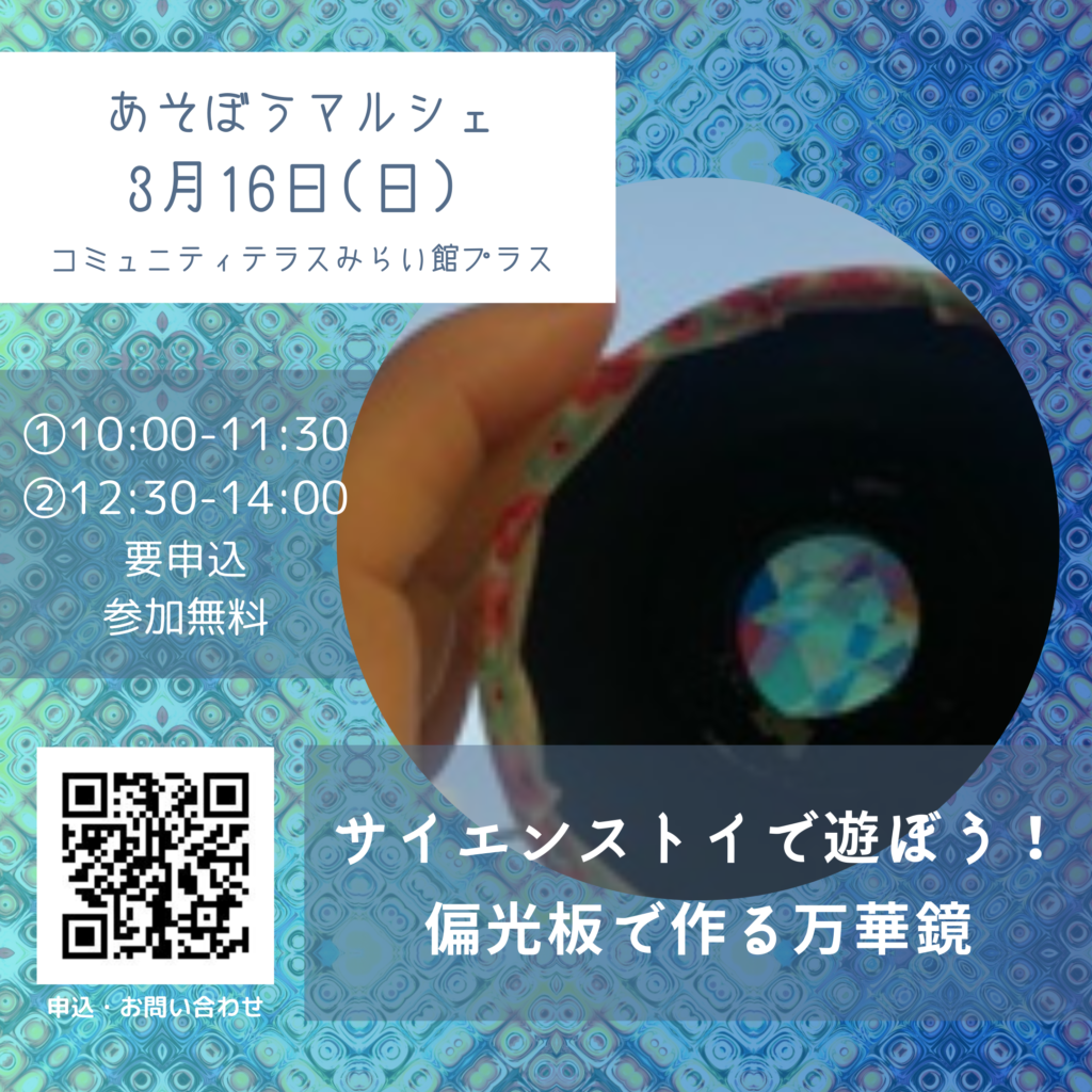 〜サイエンストイ・偏光板で作る万華鏡〜 青梅こども未来の、楽しいこと大好き!なメンバーを集めたわくわく遊び隊。 おもちゃコンサルタント・おもちゃコンサルタントマスターやおもちゃインスタラクターが様々な遊びを提案してみんな […]