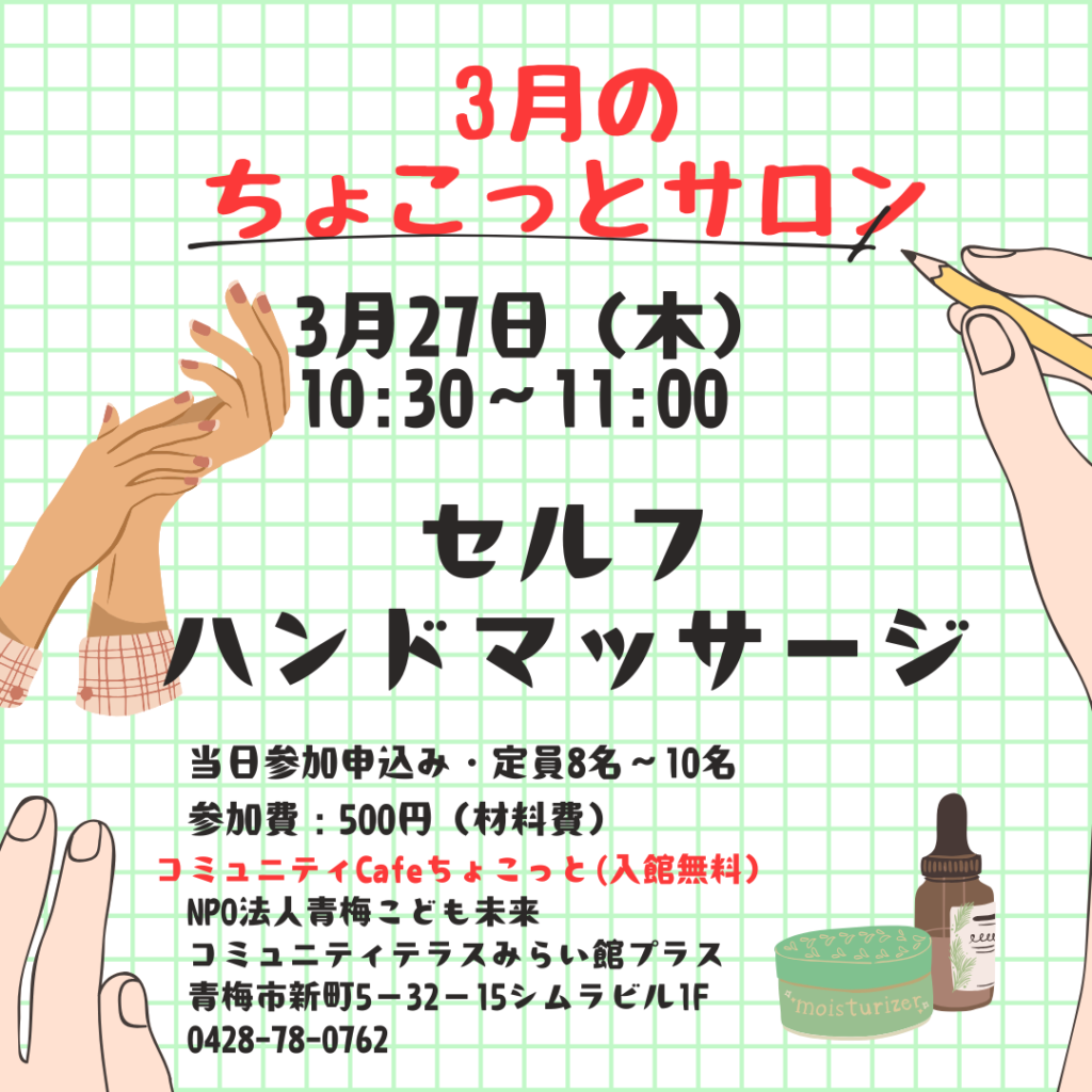 いよいよ今年度の締めくくりですね! 今回はちょっと贅沢なアロマを使ったハンドマッサージ。 講師は、ここコミュニティテラスみらい館プラスでアロマテラピー講座を毎年開催して下さっている、小平さん。 本格的な蒸留器で抽出する、 […]