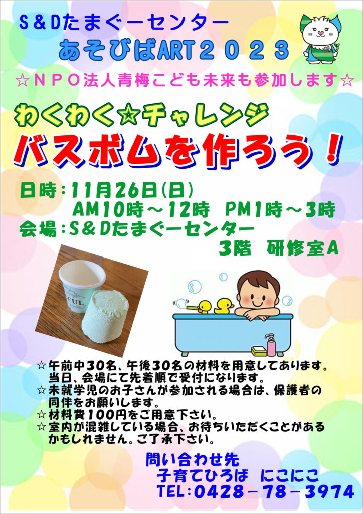 わくわく☆チャレンジ・バスボムを作ろう! 11月に入って、寒くなってきましたね! お風呂で温まって身体の芯までぽかぽかになると、よく眠れそうですね。 今年のあそびばARTは、バスボム作り。 好きな色と香りを選んでね。 […]