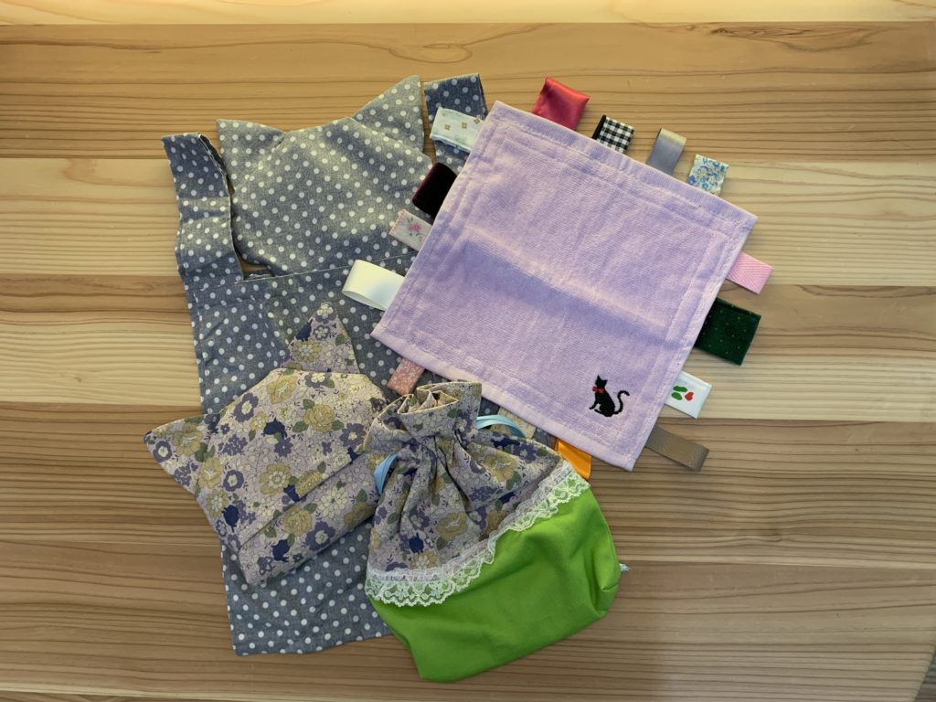 何でも食べる赤ちゃんへ。ハンカチの周りに素材、色、柄の違うリボンを縫い付けました。