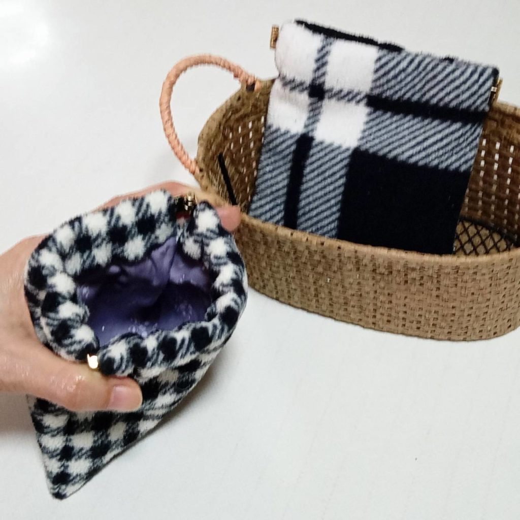 フリースを使った冬ポーチ。フワフワで触ると暖かいです。